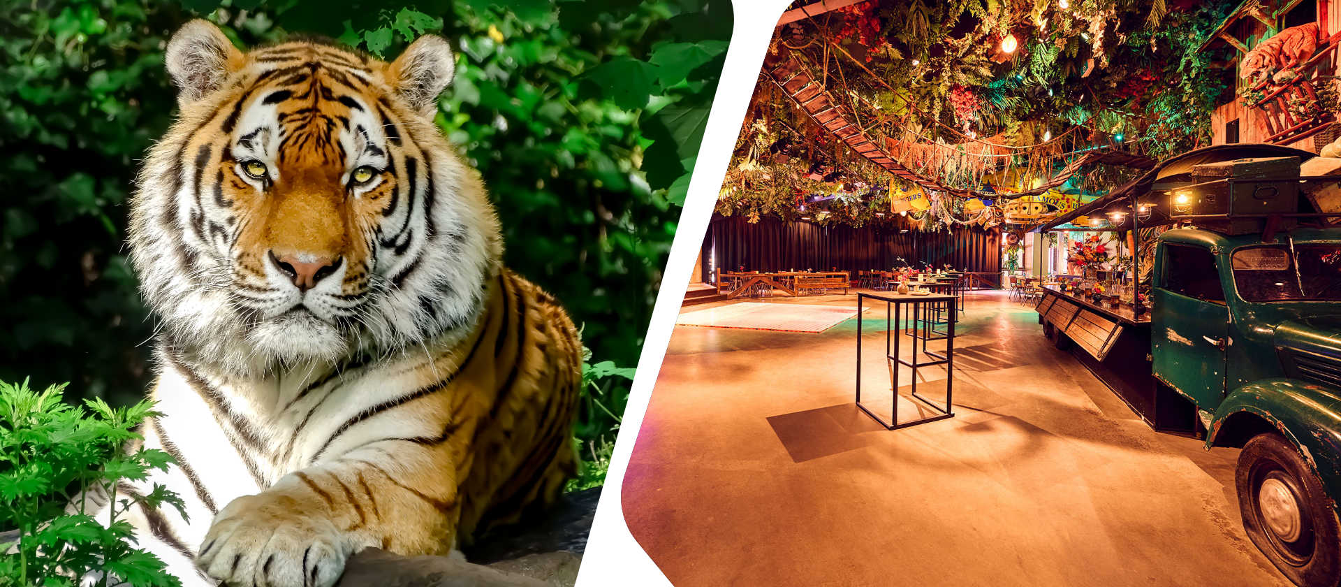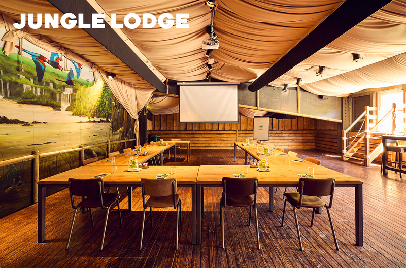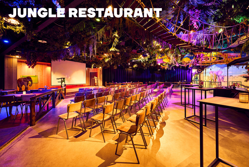 Het Jungle Restaurant ligt centraal in het park en bestaat uit een ruime ontvangstruimte met daarnaast drie zalen: Yasuni, Jangala en de Jungle Lodge. Je kunt de zalen los boeken of combineren tot één exclusieve locatie. Daarmee is de Jungle ideaal voor plenaire bijeenkomsten met de mogelijkheid voor break-out sessies.